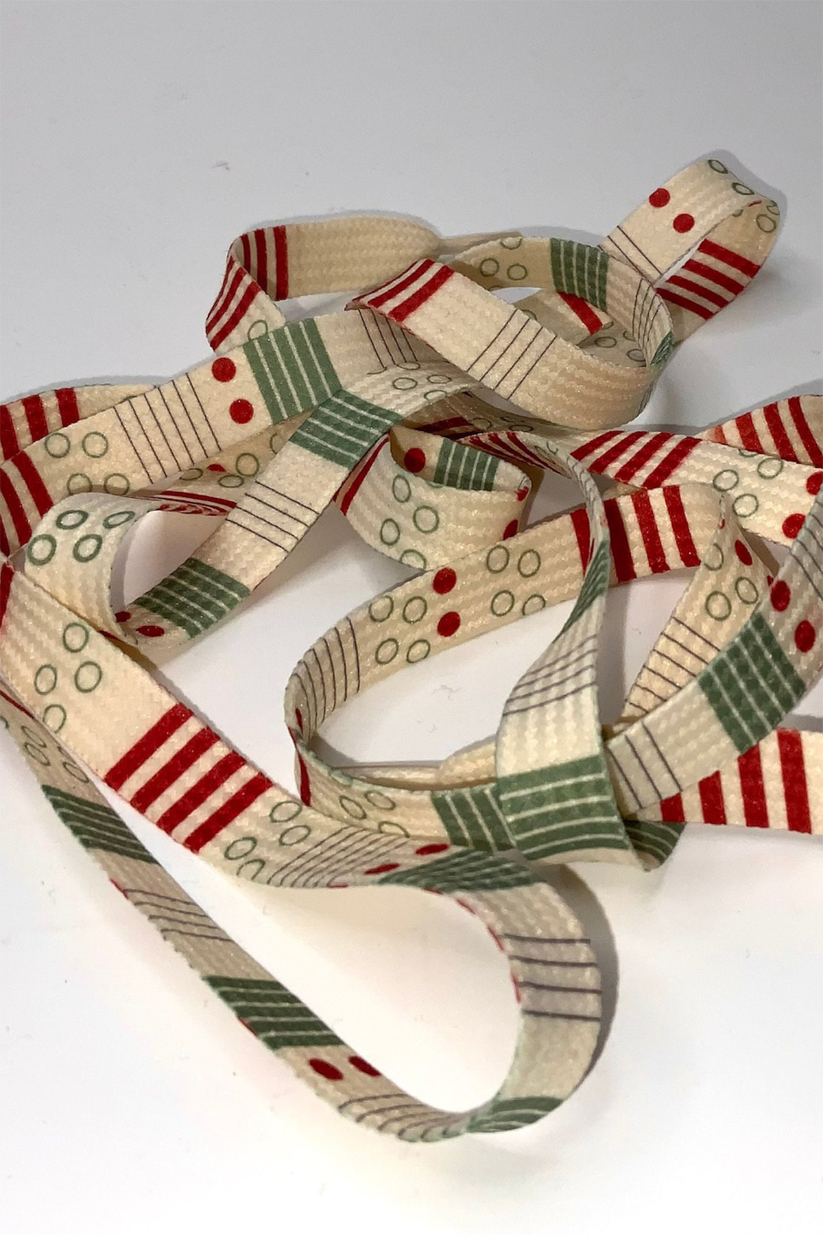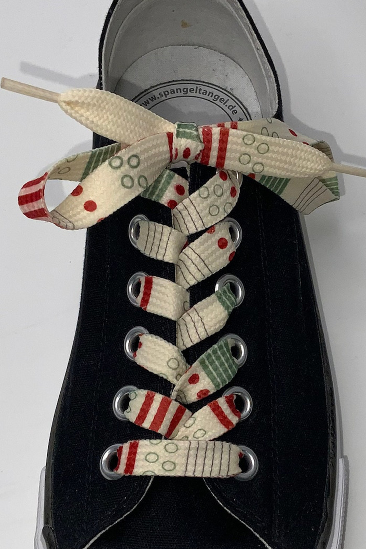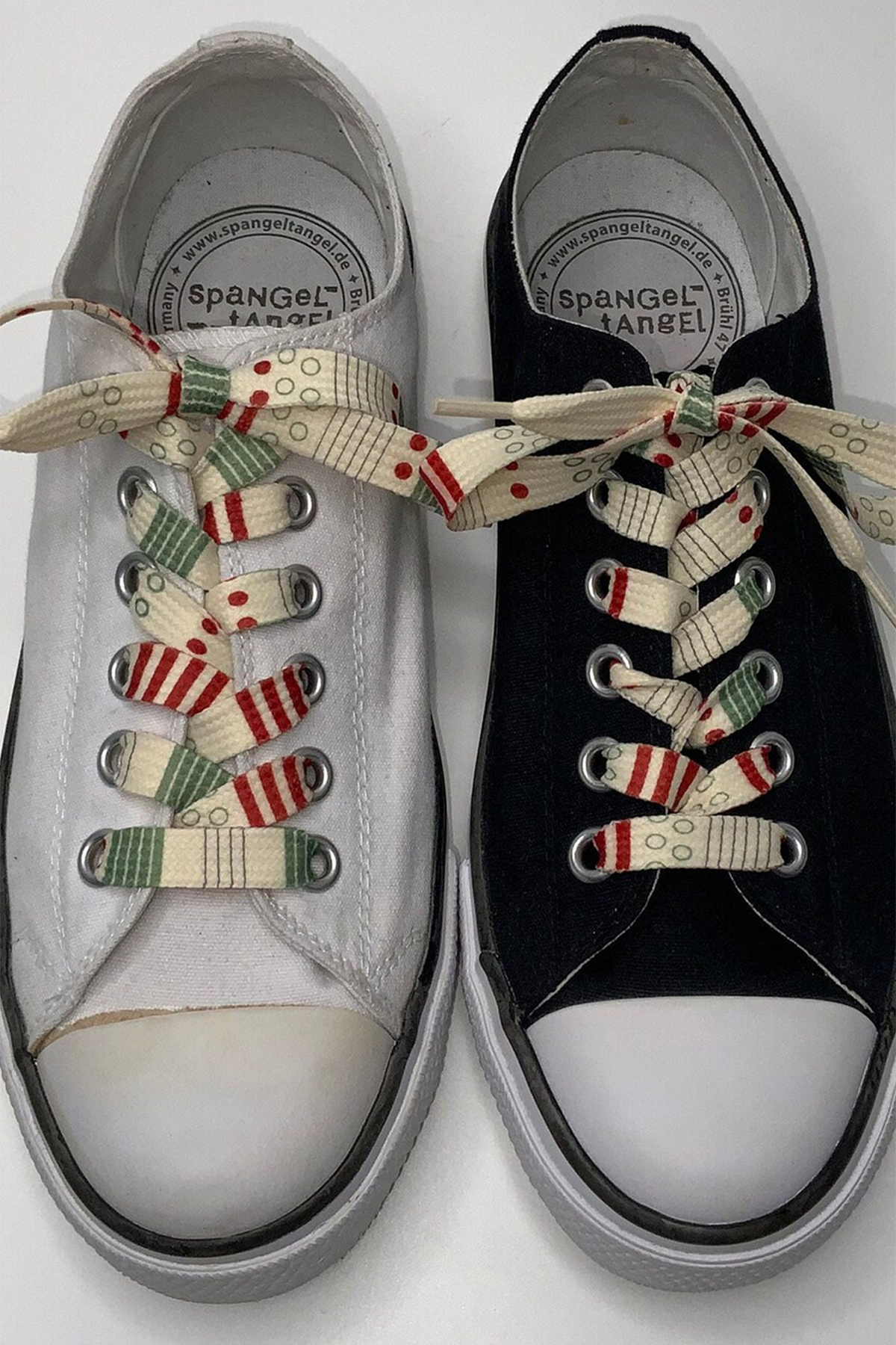 - creme Schnürsenkel mit Mustermix, verschiedene Muster in rot und grün