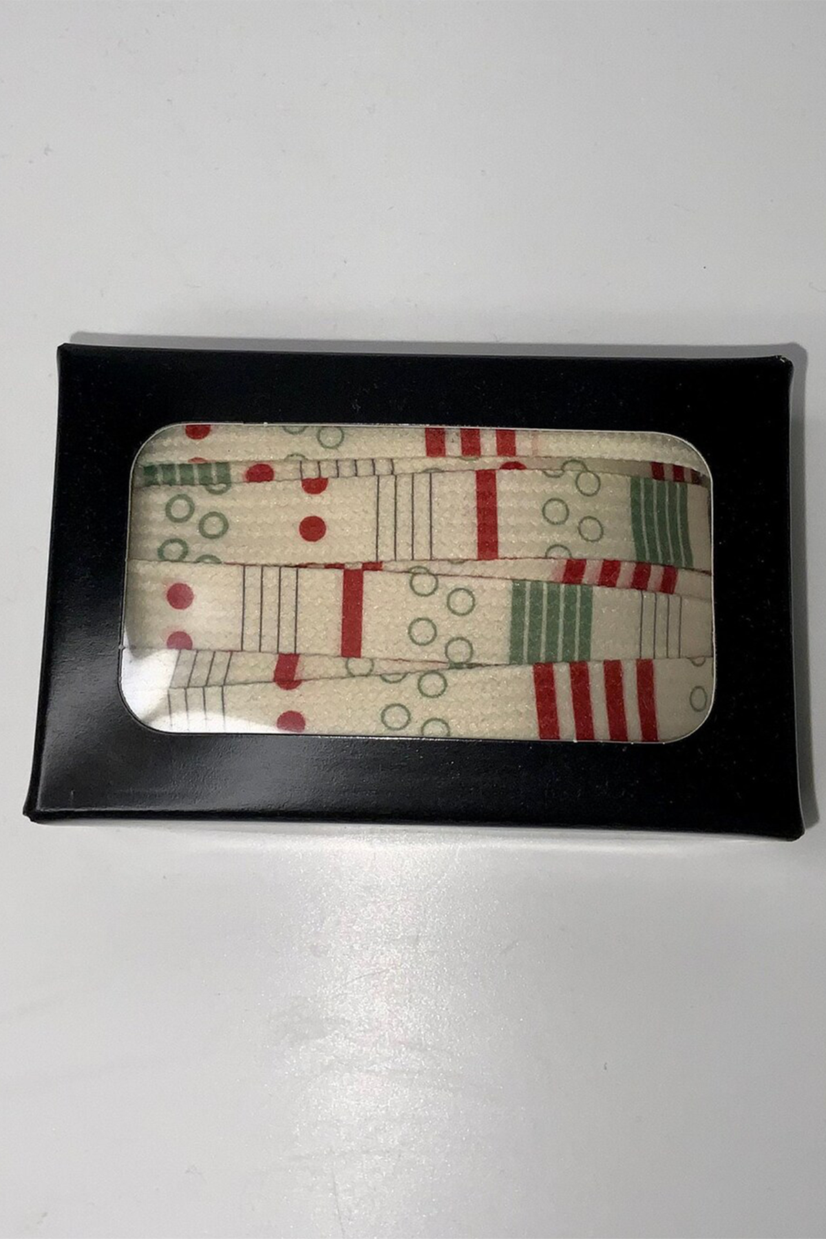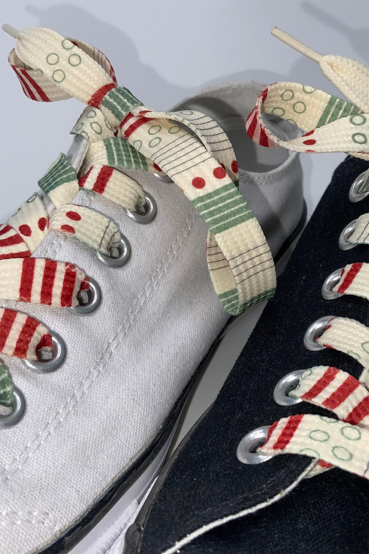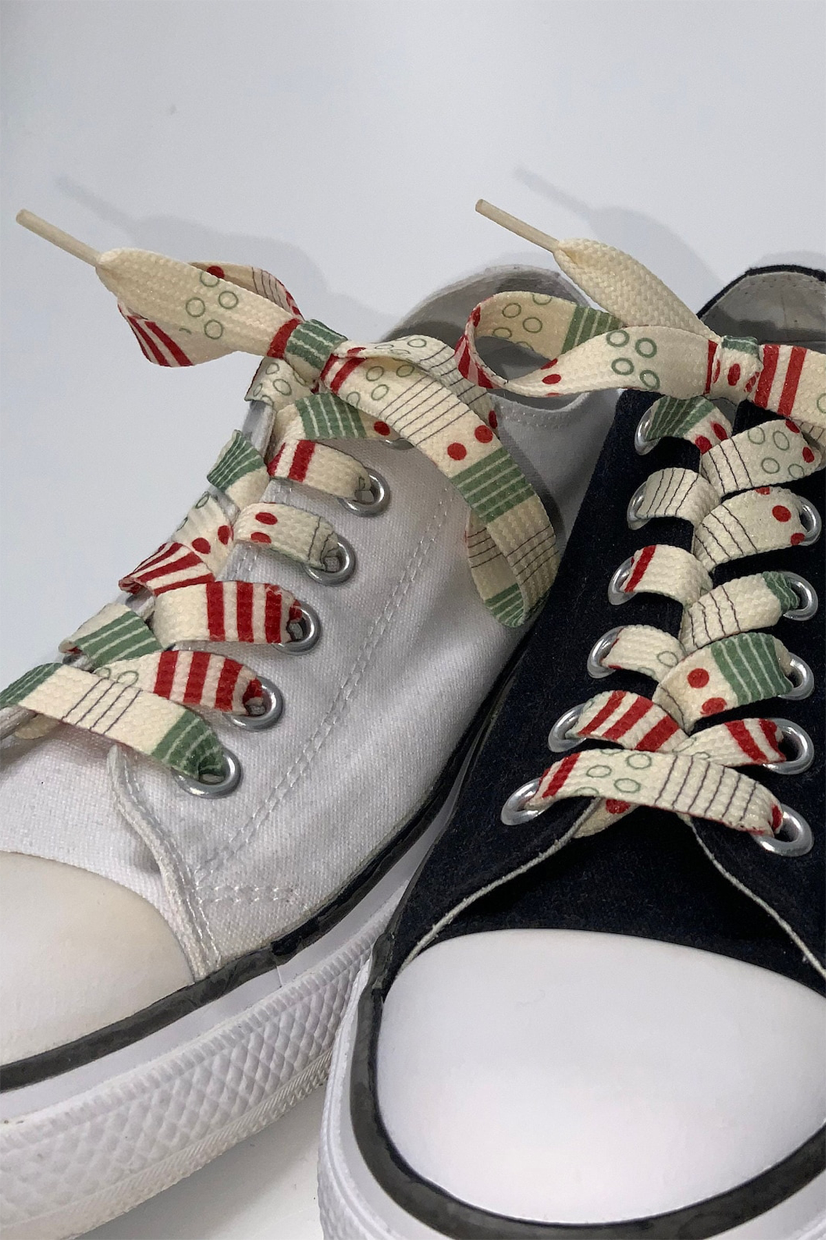 - creme Schnürsenkel mit Mustermix, verschiedene Muster in rot und grün