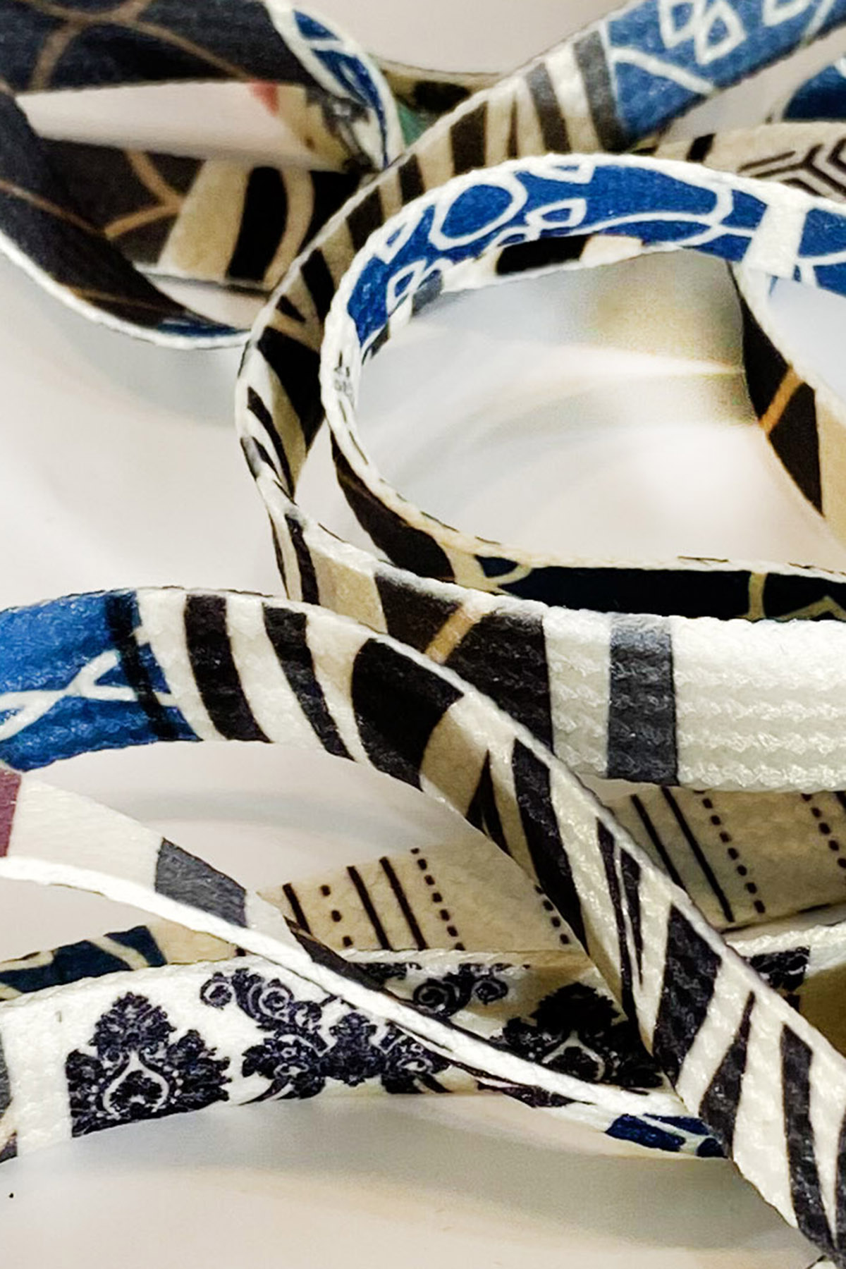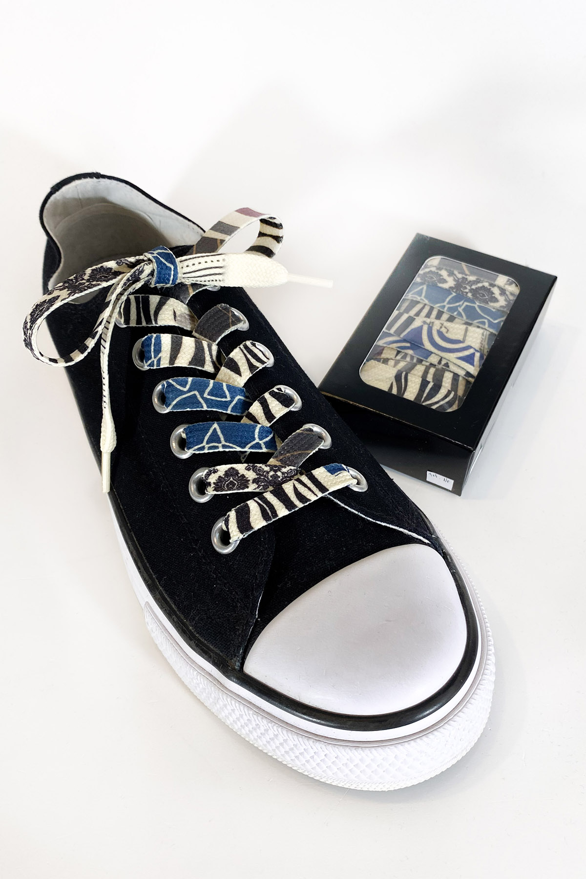 Mit diesen wunderschönen handbedruckten Schnürsenkeln verzauberst du jeden Schuh. Diese Unikate mit blau-schwarzem Mustermix sind ein echter Hinkucker. Sie sind beidseitig individuell bedruckt. Dabei ist jeder Schnürsenkel einzigartig und auch beide Seiten der Schuhbänder unterscheiden sich. Dadurch hast Du mit nur zwei Schnürsenkeln mehrere Variationsmöglichkeiten und kannst sehr einfach Abwechslung in dein Styling bringen.