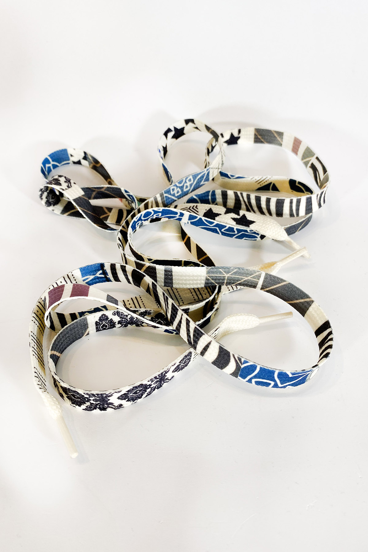 Schnürsenkel, 100 cm lang, "blau-schwarzer Mustermix ", Unikate, handbedruckt