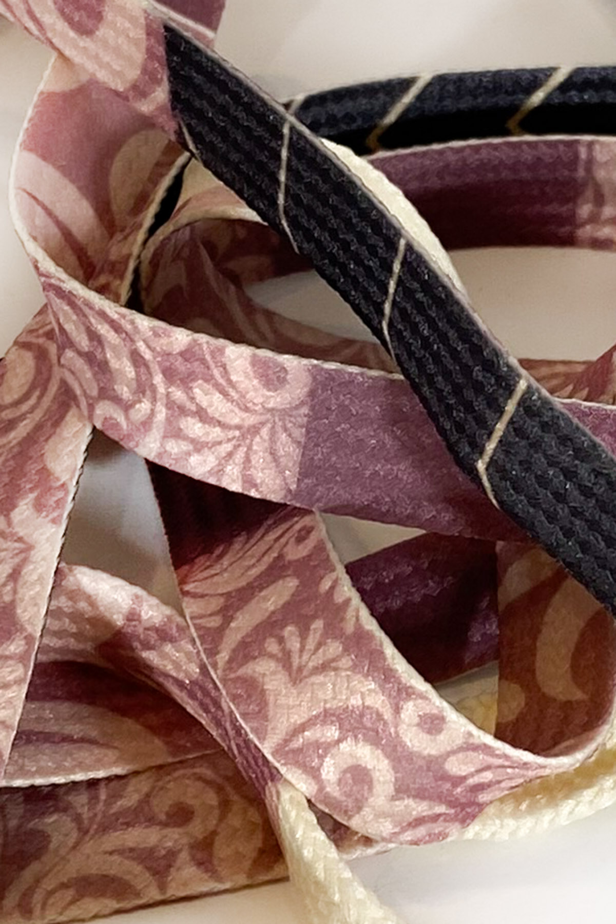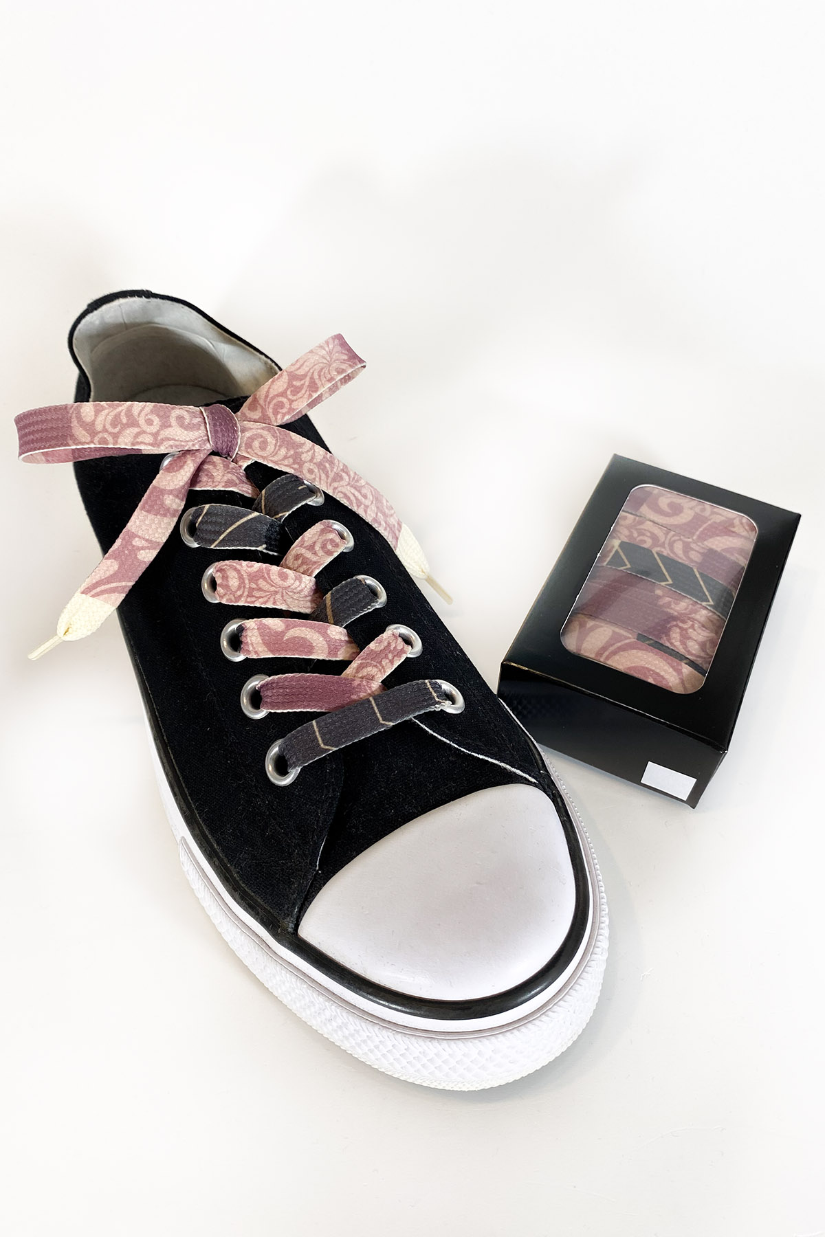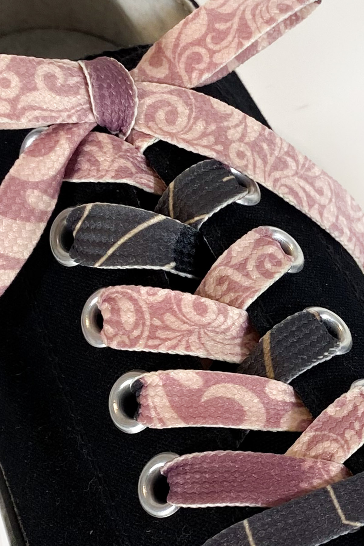 Mit diesen wunderschönen handbedruckten Schnürsenkeln verzauberst du jeden Schuh. Diese Unikate mit rosanem Ornamentemuster sind ein echter Hinkucker. Sie sind beidseitig individuell bedruckt. Dabei ist jeder Schnürsenkel einzigartig und auch beide Seiten der Schuhbänder unterscheiden sich. Dadurch hast Du mit nur zwei Schnürsenkeln mehrere Variationsmöglichkeiten und kannst sehr einfach Abwechslung in dein Styling bringen.