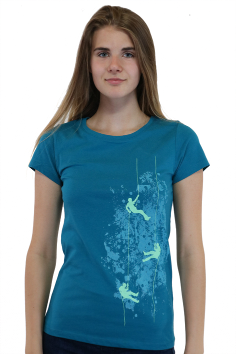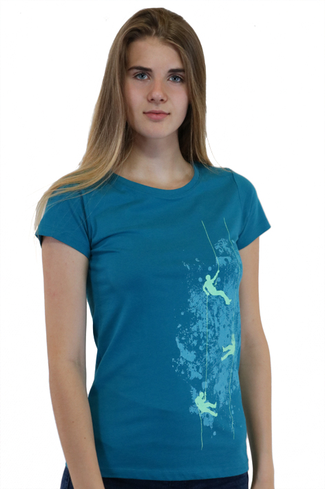 Dieses pazifikblaue Damenshirt ist auf der Vorderseite mit unserem sportlichen Kletterermotiv bedruckt. Die Kletterer sind hellgrün und befinden sich auf einer hellblauen Struktur. Auf der Rückseite befindet sich unser Logo in Druckfarbe.