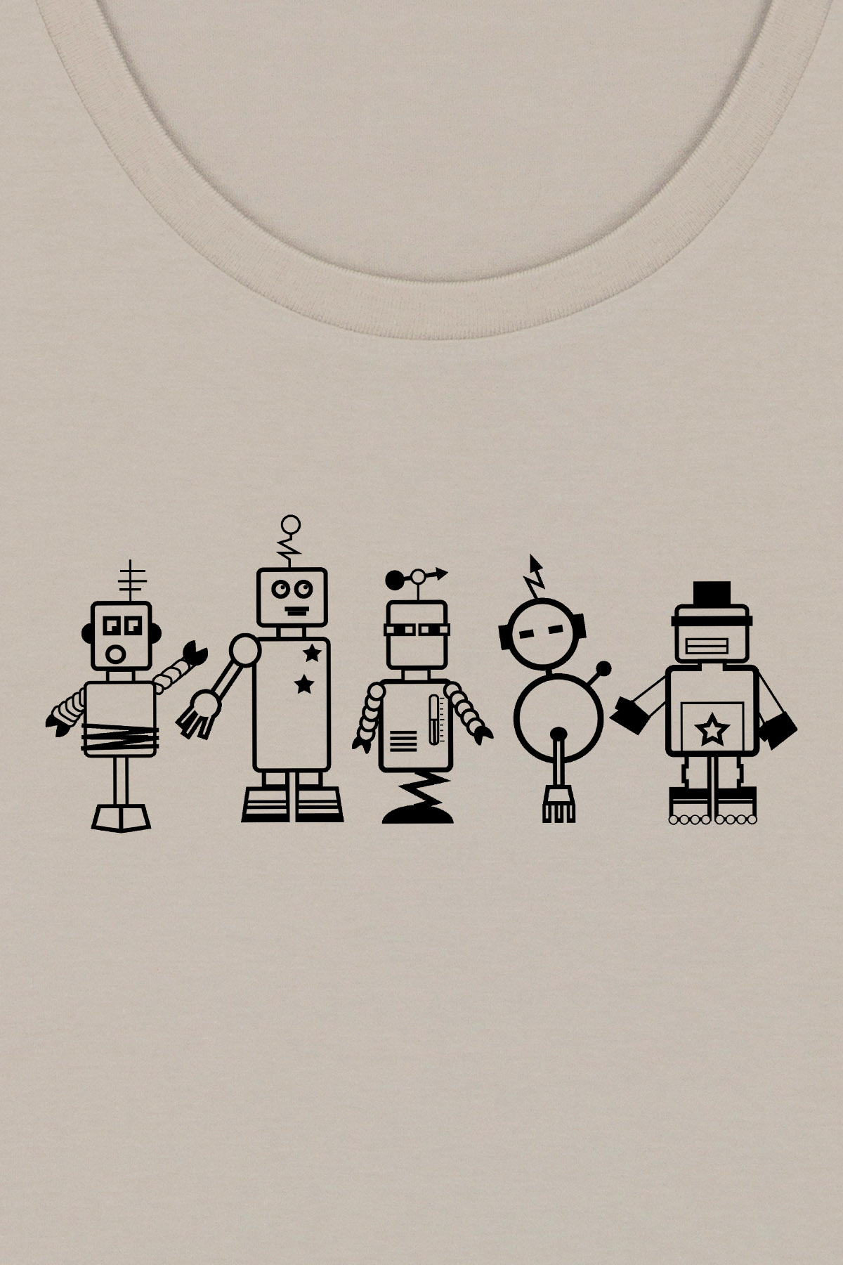 Dieses graue T-Shirt haben wir mit unserem Roboter-Motiv bedruckt. Auf der Rückseite befindet sich unten seitlich unser Logo.