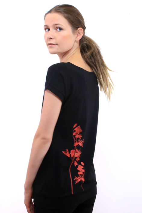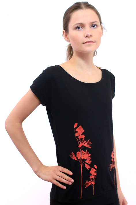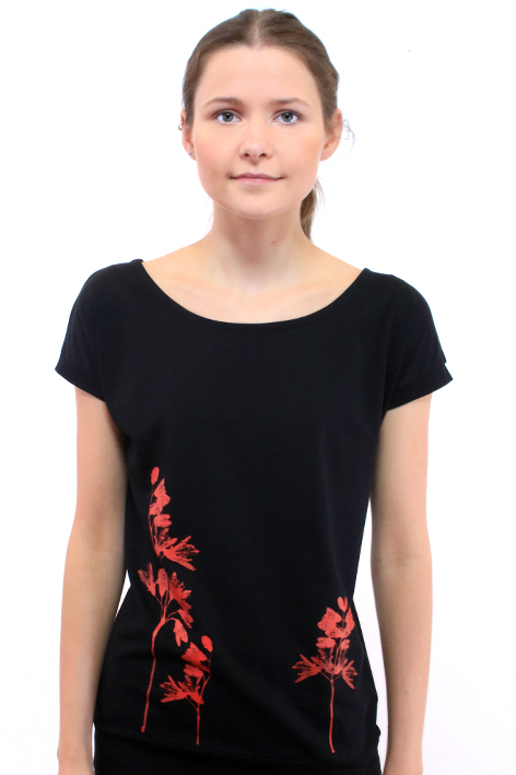 Modisch legeres schwarzes Damenshirt mit schönem roten Pflanzenmotiv. Das florale Design ist mittels Handsiebdruck aufgebracht und gibt diesem Shirt eine elegante und zugleich lässige Ausstrahlung. Das Shirt besitzt keine eingesetzten Ärmel sondern Vorderteil und Ärmel sind aus einem Stück. Die kurzen Ärmel sind mit einem kleinen angesetzten Bund versehen. Am unteren Rand ist das Shirt mit einem etwas breiteren Bund gefasst. Sowohl Vorderseite- als auch Rückenteil sind mit dem roten Pflanzendruck veredelt.