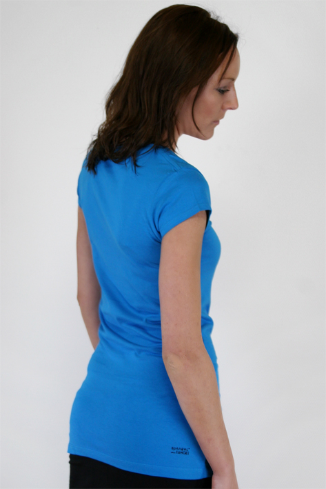 figurbetontes cyanblaues Damenshirt, tailliert, 100% Baumwolle, 30° Waschmaschine, hochwertiger strapazierfähiger Handsiebdruck, Shirtfarbe: cyanblau Druckfarbe: weiß, pastellblau, schwarz