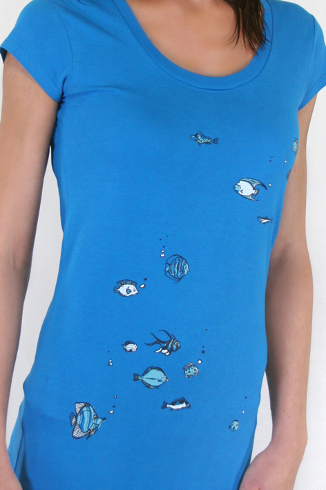 Dieses feminine Shirt, mit angeschnittenen Ärmeln hat einen formschönen halsschmeichelnden Rundhalsausschnitt und ist mit unseren verrückten Fischen bedruckt. Die Fische wurden aufwendig mittels dreifarbigen Siebdruck umgesetzt.