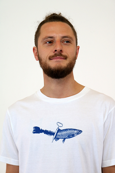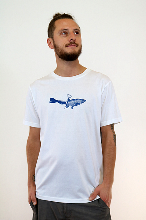 Das weiße T-Shirt ist auf der Vorderseite mit unserem Dosenfisch-Motiv in einem dunklen blau bedruckt.