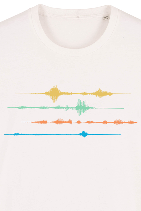 Schickes cremeweißes Rundhalsshirt mit unserem Frequenz-Motiv bedruckt. Auf der Rückseite befindet sich unten seitlich unser Logo.