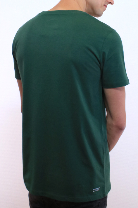 Schickes dunkelgrünes Rundhalsshirt mit verspieltem Kosmonautmotiv dekorativ bedruckt.