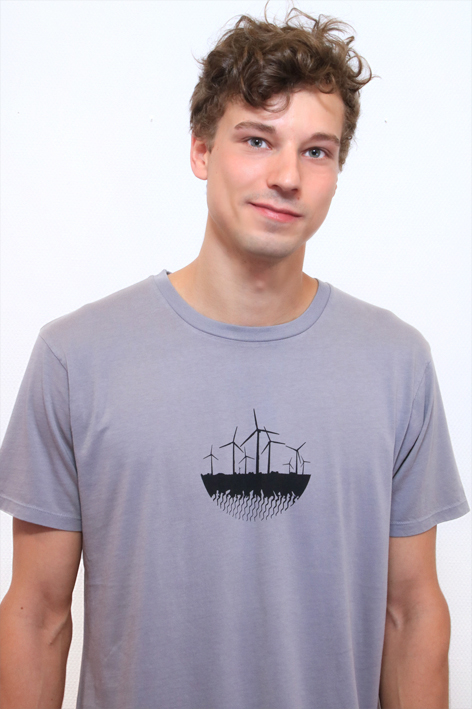 - graues Herrenshirt mit Windrad-Motiv auf der Vorderseite