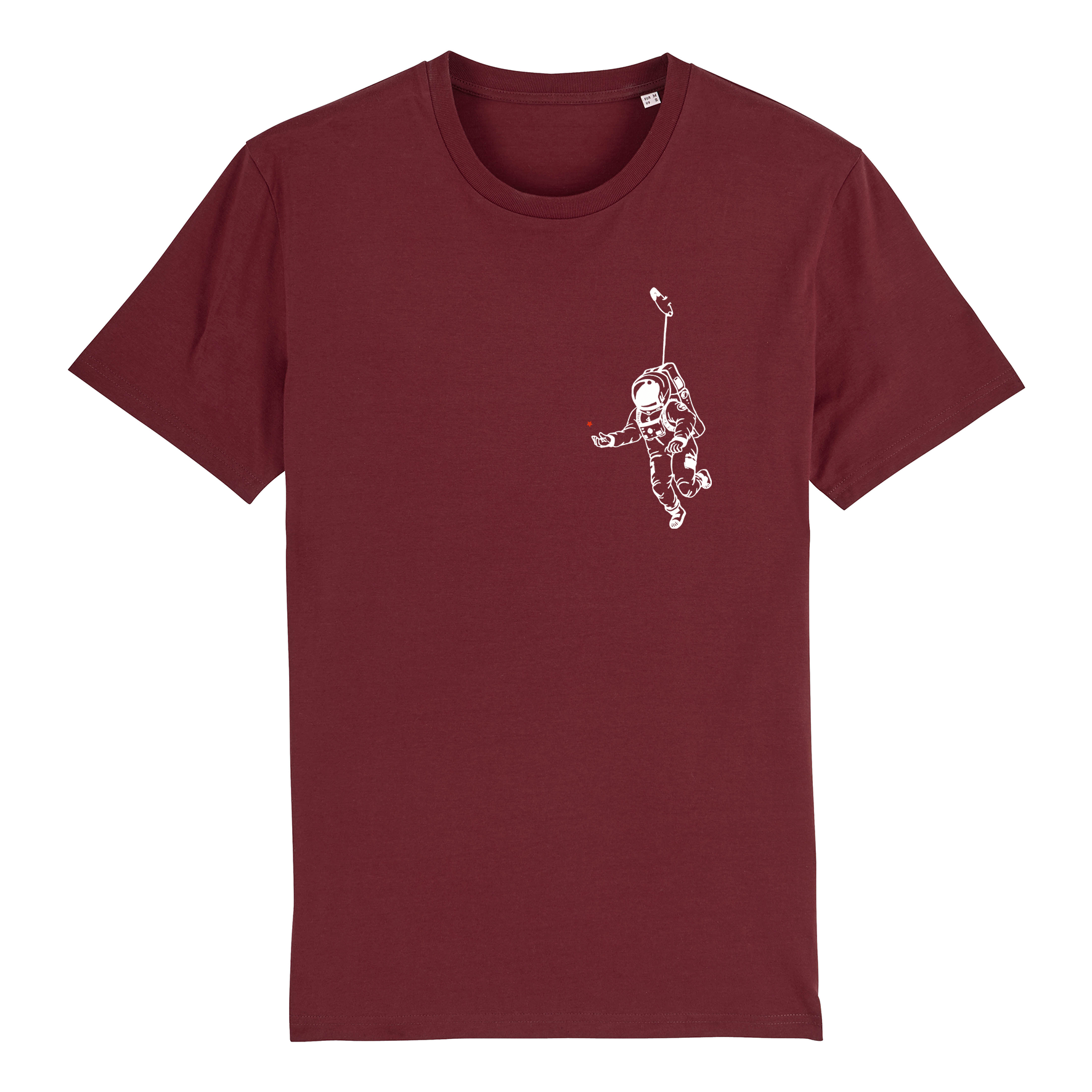 Hochwertiges kurzärmliges rotes Herren-T-Shirt mit Zweifarbsiebdruck Kosmonauten-Motiv.