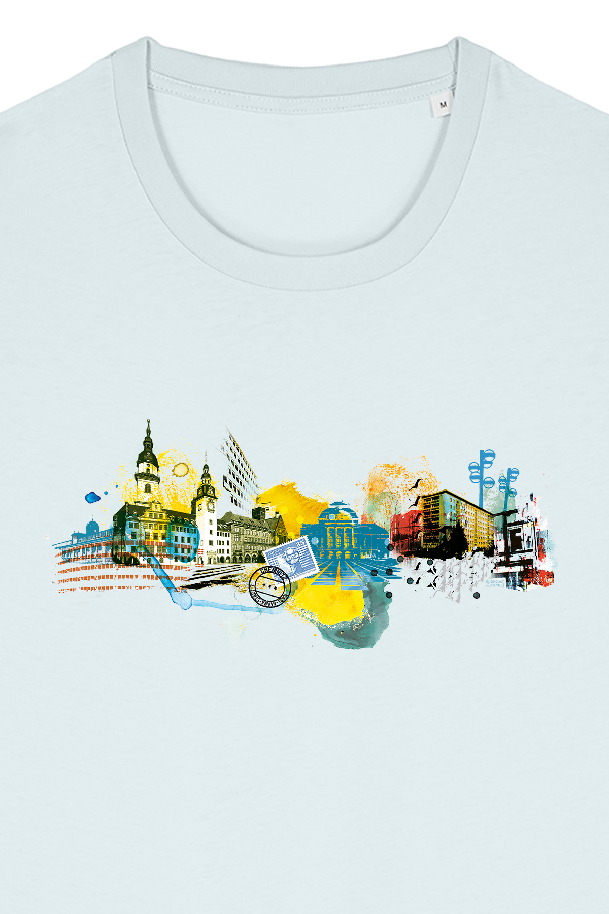 Für alle Chemnitzer und Besucher haben wir dieses hochwertige T-Shirt mit dem künstlerisch gestalteten Chemnitz-City-Motiv auf der Vorderseite. Es ist ein schönes Souvenier für Besucher und ein einzigartiges Geschenk für Bewohner unserer Stadt. Unten auf der Rückseite befindet sich unser kleines Logo in Druckfarbe.