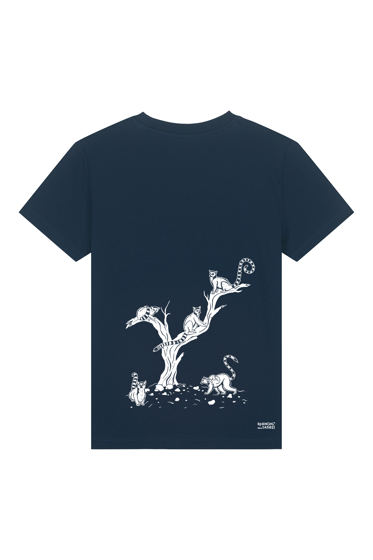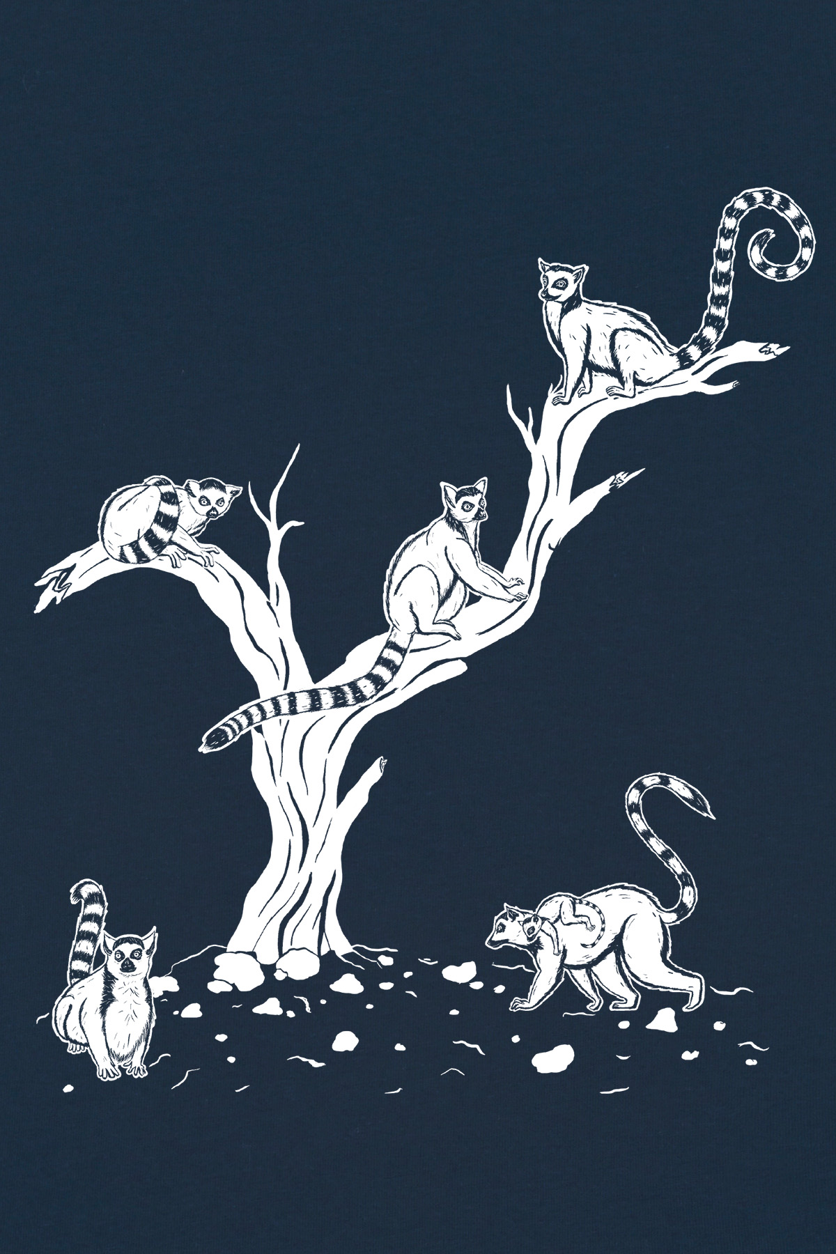 Obwohl man Lemuren normalerweise nur auf Madagaskar finden kann, haben wir es trozdem geschafft diese exotischen Primaten zu uns zu bringen und sie auf unsere T-Shirts zu drucken. Aber keine Sorge, damit sie sich auch hier wohlfühlen, bekommt diese Rasselbande natürlich genug Möglichkeiten ihre Kletterkünste auf dem niedlichen Rückendruck zu zeigen. Auch der pummelige Lemur auf dem Brustdruck fühlt sich durch den weichen Bio-Baumwollstoff pudel wohl.
